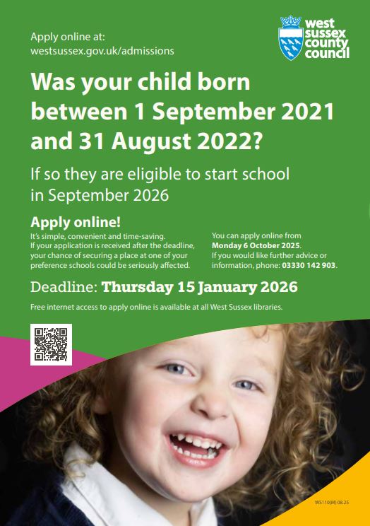 Admission to a Reception class will be in accordance with West Sussex County Council’s Admissions Policy for community and controlled primary schools.